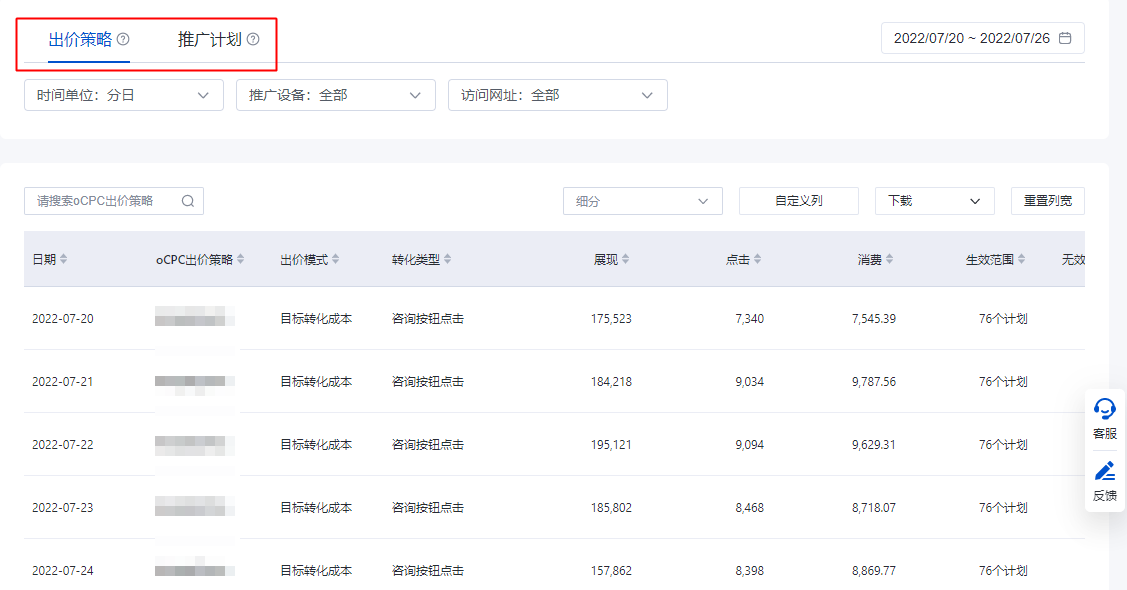 【出价策略】:呈现“oCPC出价策略”维度下的基础设置项(如出价模式,生效范围等),和对应的展现,点击,消费,目标转化量,目标转化成本等。如果您需要查看出价策略内某计划数据,请前往【推广计划】下搜索该计划名称查看。【出价策略】页面不提供某出价策略下绑定的单计划具体数据。